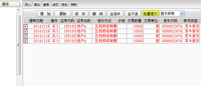 所谓预埋单,就是实现设定好你要买卖的品种、数量,等到需要的时候一堆订单就可以一次性发送出去。像我就会在2点45到2点55分这段时间慢悠悠的设置预埋单,等到2点55一键发送即可。你或许会问,A级+B级的价格始终在变,这个怎么应对呢?别怕,为什么我要用通达信版,就在于其相比我券商提供的同花顺版委托软件多了市价预埋单的功能,下图中五档即成剩撤就会要求券商将卖一到卖五的挂单全部扫完,剩余的撤销。对于我等小散,这个功能对于比较活跃的分级基金,相当于卖一价买入的。