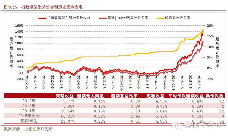 图表15为历史回测的结果。从图中可以看出,策略实现了5%的稳定超额收益,超额收益几乎没有回撤。对于指数增强操作而言,折价套利的方法也是一种有吸引力的选择。