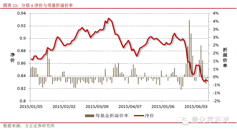 分级A的价格容易受到套利资金的影响,关注相关产品折溢价对于研判A的短期涨跌幅意义重大。当溢价过大时,套利资金入场进行溢价套利,申购母基金后拆分成A、B份额分别卖出,这一过程会打压A类的价格,造成对A类的错杀;反之当折价时会有大量B类持有者选择买入A配对转换赎回,拉升A的价格。