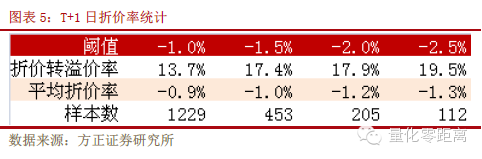 由图表6也可看出,T+1日绝大部分折价率位于小于0的区间。此外,随着阈值的增加,虽然T+1日折价转溢价概率有所上升,但平均折价率仍然很高。