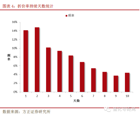 图表4展示了折价率首次达到-1.5%后折价持续天数的分布。图中显示折价套利的机会在相当长的时间内都是存在的。