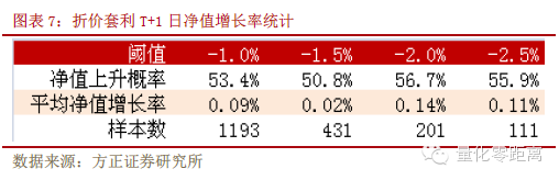 由图表5可看出,在-1.0%至-2.5%的阈值区间内,T+1日的折价转溢价概率以及平均折价率均处于相当低的水平,意味着套利的最好方式还是合并赎回,折价较难在一天内产生价值回复现象。