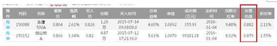 ③——母基赎回后资金到帐时间,不同券商T 2至T 4不等,华泰证券为T 2到帐,例如,周一赎回母基,周三开盘后资金可用,周四资金可取。(PS:笔者2015.7.14赎回的500等权(502000),7.17资金才到帐可用,不知是否和不同基金公司有关?)④——T日合并的操作是可撤单的(上交所分级除外),T+1日赎回的操作也是可撤单的⑤——折价率是根据盘中母基估算净值(跟踪指数*0.95)进行计算的,因此估算净值的误差大小直接关系到套利成败, 所以不能选主动管理性母基,同时要注意基金仓位的变化,在2015.6.15-7.15这段行情中有基金经理为应对赎回或者避免下折,降低仓位,增加现金持有。⑥——上交所分级合并是5万份起的,也就是说你A、B份额需要至少各买25000份,深交所分级200份起