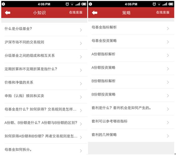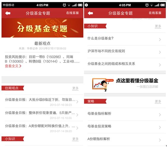 另有每日更新的分级基金日报,对各类分级投资机会进行提示,“小知识”栏目为分级小白打基础,“策略”栏目为分级小白进阶。(这三个栏目对非华泰客户也是开放的)