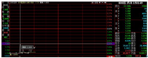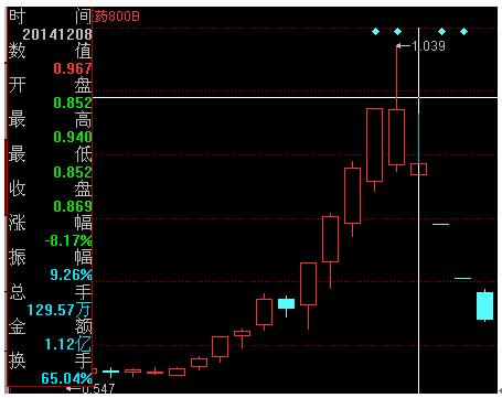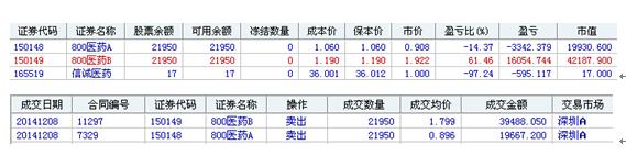 800医药B(150149)2014.12.8开盘后走势图下图是800医药B(150149)2014.12.8-11的K线,12.9/10一字跌停,无法卖出,如果是不支持T+1盲拆的券商,不但无法盈利,反而可能亏损。