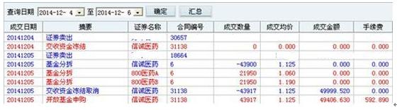 2014.12.4周四,场内申购信诚医药(165519)50000,净值1.125,申购费1.2%,可得份额为:50000/1.125/1.012=43917份2014.12.5周五,盲拆母基,记得填偶数啊,因为2份母基才能分拆成A,B各1份
