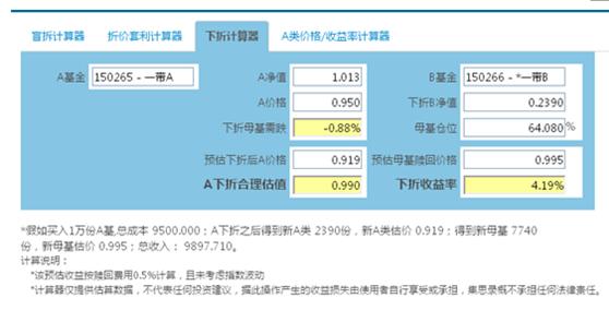 如是以7.29一带A(150265)收盘价0.972买入,盈利将降为50,收益率为1%决定是否进行下折套利时可参考集思录中下折计算器,如在10%以上可参与