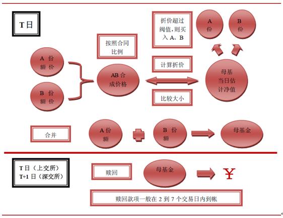 T日,B触发下折;T+1,买入A(也有提前买A,等下折的);T+2,下折;T+3,卖出A,赎回得到的母基(也可分拆,T+4卖出A、B)