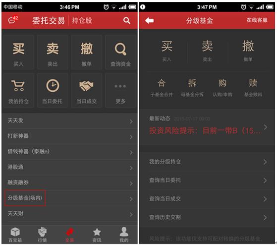 华泰证券做为首家可实现母基金盲拆、盲合的文艺券商,现更在其手机交易端涨乐财富通中推出专门的分级基金交易菜单,以实现买、卖、申、赎、分拆、合并的所有操作。