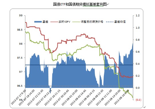 相对于利用单只债券进行期现套利,针对ETF进行套利在操作上有一定的特殊性:国债ETF是一篮子可交割券的组合,要根据市场行情数据,计算国债ETF相对国债期货合约的基差,因此关注的重点是组合的基差,而不是个券的基差。