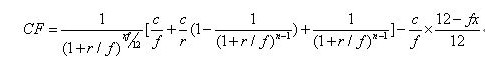 可交割债券和名义标准券之间的价格通过一个转换比例进行换算,这个比例就是通常所说的转换因子。转换因子的计算是面值1元的可交割国债在其剩余期限内的所有现金流量按国债期货合约票面利率折现的现值,这是国债期货合约中最重要的参数之一。国债期货转换因子的具体计算公式如下: