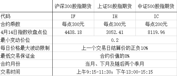 交易金额方面,按照4月14日指数收盘价以及10%保证金计算,1手沪深300股指期货需保证金13.31万元,1手上证50股指期货需保证金9.15万元,1手中证500股指期货需保证金16.24万元。