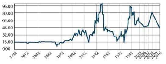 白银在70年代初的价格只有2美元/盎司左右,1980年1月21日白银涨到了它的历史最高价:每盎司50.35美元(如果考虑到美元贬值的因素,大约等于现在120美元/盎司),比前一年上涨了8倍,10年时间上涨了25倍。本轮牛市从2001年的4美元/盎司起步,究竟会上涨到何处呢?