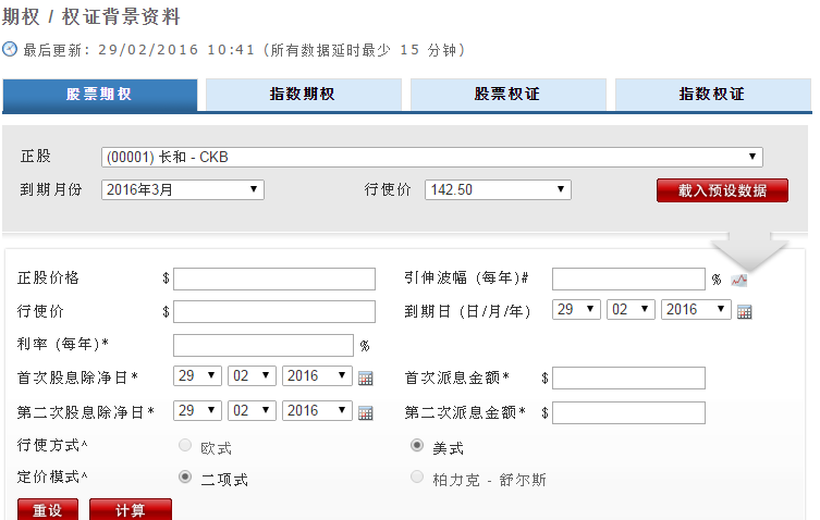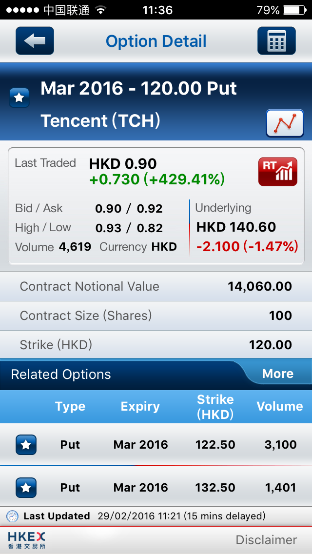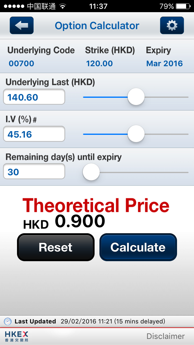 用港交所的期权APP,也可以计算期权的理论价格,用APP选择个股,然后选择不同到期日的期权,在期权页最右侧上方,有个计算器图标,点击后会计算出当前期权的理论价格,以腾讯2016年3月底到期的行权价120港元的PUT(认沽)为例,基本上交易现价与理论价格相同: