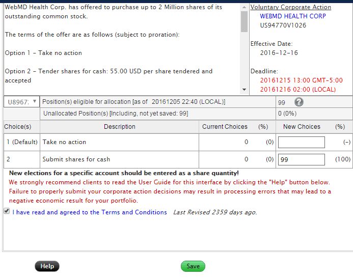 原则上,WBMD的股票是按比例回购,但是如果你拿的股份数少于100股的话,会全额回购。所以,有IB的同学,可以买99股WBMD。然后,IB 中的Message center 中的cooperation action 里会给你发条消息,问你参不参与交易。按说明,自己选好就行。当然,英文不好的同学就别参与了。