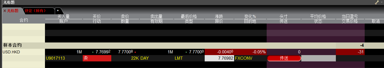 持有美元想换成港币,也是交易USD.HKD这个货币对,不过交易方向正好相反,是点击该合约,选择”卖“,然后依次选择要卖出的数量,此处的数量也是指美元的数量,也就是指你想把多少美元换成港币,默认也是2万5000美元,自己可以选择修正。然后选择价格,目的地也是下拉选择”FXCONV“。点击传送即可。