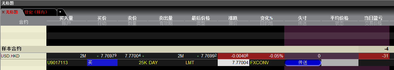 登录IB的PC端交易平台IB TWS(下载地址:https://www.ibkr.com.cn/cn/index.php?f=16350),登录后选择“标准模式的交易平台”,在“样本合约”下输入“USD.HKD",注意USD.HKD中间有个“.",这个合约就是美元兑港元的货币对,右击该合约,选择”买“,然后选择想买入的数量,默认是25K(即2万5000美元),这个数量大家可以根据自己想要买入的美元数量自己选择修改,然后选择交易价格,最后选择”目的地“,这个项目至关重要,一定要下拉选择”FXCONV“,然后点击”传送“即可。(注意:IB默认的目的地是IDEALPRO,一定要下拉选择FXCONV)