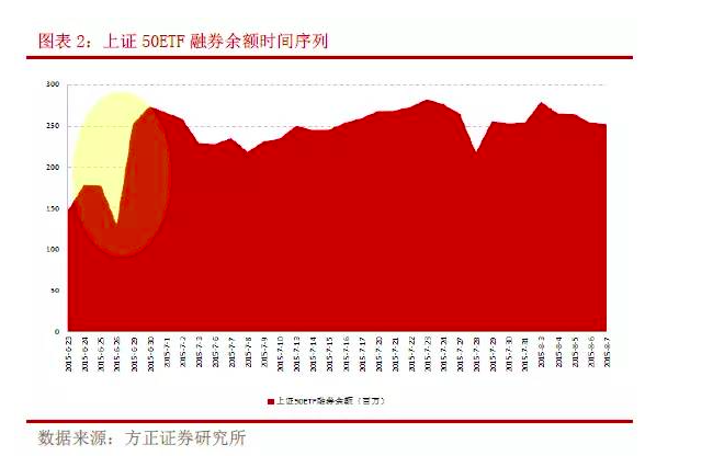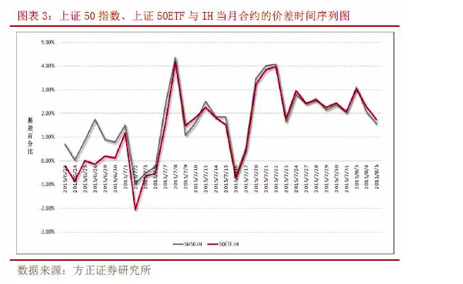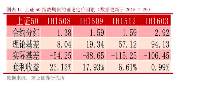1.1 融券困难导致反向期现套利“可望不可及”根据交易所的规定,期指交割结算价是交割日现货指数最后两小时的算术平均值,这一交割机制保证了期指在交割日必将收敛于现货指数,从而使得一切期现套利的实现成为了可能。以7.29的数据为例(图表1),即便考虑合约到期前成份股的分红,IH1508合约的理论价格应该高于上证50指数8.04个点,然而实际该合约贴水现货指数高达54个点以上。如果“买入IH1508合约,同时卖出上证50ETF”进行反向期现套利,在考虑手续费以及资金配比等实际问题的情况下套利年化收益可达23.12%(可参考方正金工每周的基差跟踪报告)。但问题来了,我们能通过上述方法如愿获取这一收益吗?答案是不能,原因如下1. 融券困难。目前融券市场一票难求,融券卖空上证50ETF或者融券卖空上证50指数成分股的实现几无可能。图表2展示的上证50ETF融券余额的时间序列,在期指出现大幅贴水的同时,融券余额迅速攀升(黄色提亮部分),然而随着融券规则的收紧,融券余额基本维持在一个水平线上。买IH同时融券做空上证50ETF的反向期现套利犹如过眼云烟,诱人的期现套利空间再度可望不可及;2. 在仍存在的融券可能的6月下半旬(当时期指大幅贴水现象已经出现),上证50ETF出现了大幅的折价,从而导致套利空间大打折扣。图表3展示的是上证50指数与IH的价差(棕色曲线)以及50ETF与IH的价差(红色曲线),显然在6.25-7.1期间,虽然IH已经一定程度上贴水上证50指数(价差比超过1%),但由于50ETF折价,其与IH的价差仍处在0值附近,套利收益较为有限。