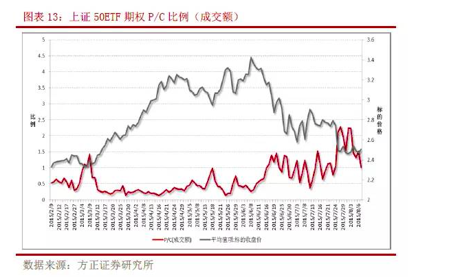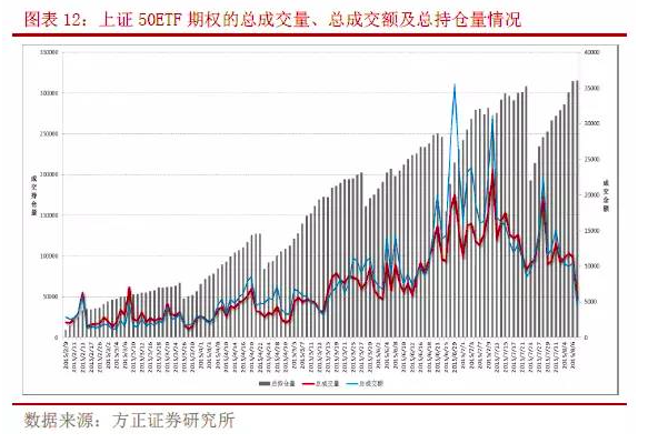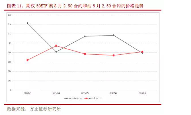 风险提示:1. 期权和IH的合约到期日不同,可能出现“期指交割日当天,期权合成现货价格未能及时回归”的情况;2. 期权市场的流动性不充裕,导致建仓30份期权合约的冲击成本较高。2. 本周市场行情回顾本周标的50ETF低位震荡运行,价格一直围绕在2.50上下窄幅震荡。期权价格走势基本跟随标的价格运行,图表11给出8月行权价格在2.50的认购期权和认沽期权的价格走势作为参考。截止至本周五,50ETF期权总持仓量为315153手,持仓量创上市以来新高。周五当日成交量为47387手,成交金额4384万元。由于当天交易所系统出现问题,上交所于9:56暂时停止了上证50ETF期权合约的交易,直至14:00恢复交易,从而导致单日成交量和成交金额巨幅萎缩。从本周整体水平来看,期权市场的交投热情相比前几周略有降温。