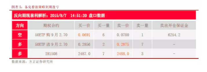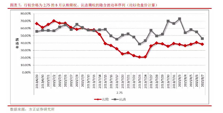 从本周五收盘后的50ETF期权的隐含波动率水平来看,认沽期权的IV依然占据绝对优势,但两者之间的空间有所收敛。上证50指数期货的大幅贴水吸引了较多的投资者利用期权合成现货空头以实现反向套利,从而令认沽期权相对认购期权严重高估。此外方正金工认为,经历了这次股灾的风险教育,投资者对于期权的风险对冲功能的认识将进一步提升,因此当市场出现下行风险时,投资者对于认沽期权的需求将会提升,从而使得认沽期权的价格高估。