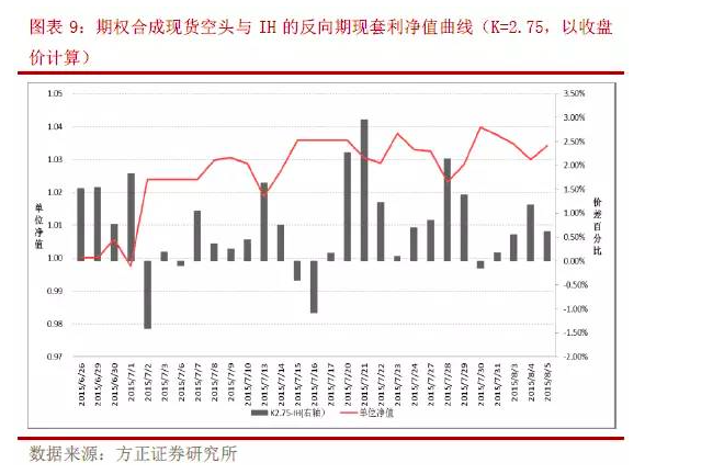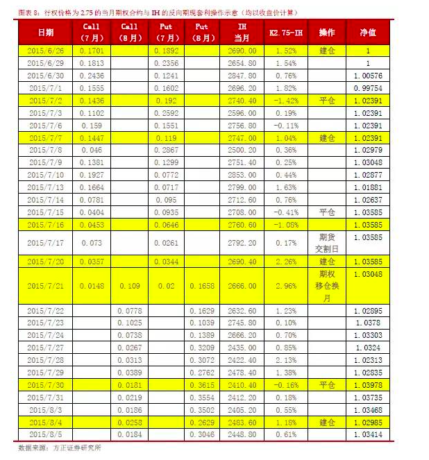 根据上述想法我们进行了数据回溯,具体操作的思想如下:1. 初始资金:100万;2. 操作:卖30份行权价格为2.75的当月认购期权、买30份行权价格为2.75的当月认沽期权、买入1份当月的上证50指数期货;3. 上述操作占用资金大概在30万左右,占用资金比例较低;4. 当合成现货价格与IH间的价差百分比超过1%,进行第2步骤的操作;当价差百分比回归至0,则全部平仓;5. 若到期货交割日之前,价差仍未回归,则期货头寸参与交割结算,并同时将期权合约头寸平仓;6. 期权到期日前一天对所持期权合约进行移仓换月,即平仓7月期权合约同时建仓相应行权价格的8月期权合约。图表8详细给出了按照上述思路在行权价格为2.75的期权合约上的具体操作步骤。
