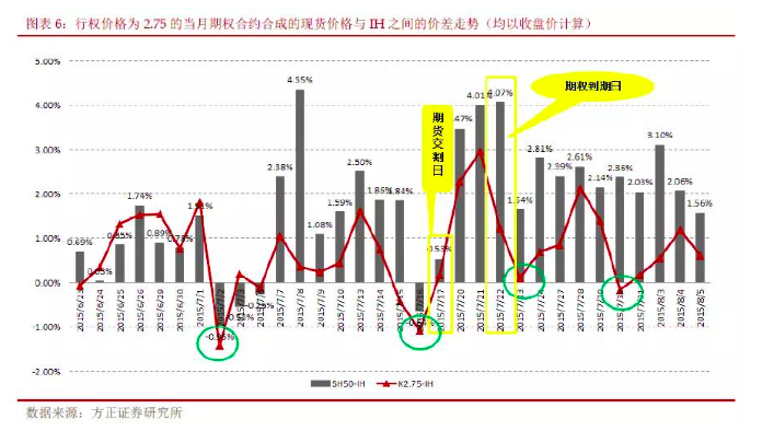 期权合成现货空头操作:1. 卖出“50ETF购9月2.7”买入“50ETF沽9月2.70”, 合成50ETF空头,空头持有成本=2.7+(0.0691-0.2785)=2.4906;2. 买入“IH1508”,多头持有成本=2488;3. 50ETF期权合约的乘数为10000,上证50ETF的基金份额净值设计为上证50指数的千分之一,IH合约的乘数为300。因此,为了构建市值相等的期现套利头寸,30份50ETF期权合约对应1份IH合约;4. 理论套利收益=(2490.6-2488)*300=780元。图表6展示的是行权价格为2.75的当月期权合约合成的现货空头持有成本与IH当月连续合约的价差图(红色曲线图),需要一提的是为了方便数据采集,我们这里的数据全部以收盘价计算,且没有考虑手续费。图表6中的棕色柱状图则是上证50指数与IH当月合约的实际价差。显然,从7月初开始,利用期权合成现货空头所构成的价差已经远不及实际价差,这是由于部分聪明的投资者早早的洞察到了利用期权合成现货空头来赚取期指贴水空间的机会,从而导致了认沽期权相对认购期权的IV高估(参考图表7),这使得构建合成现货空头的成本上升。图表6中绿色圈出的位置是合成现货空头与IH之间的价差回归0(甚至在0轴下方)的时间点,可见如果我们在价差百分比超过1%时建立反向期现套利头寸,我们有足够的机会获利平仓。