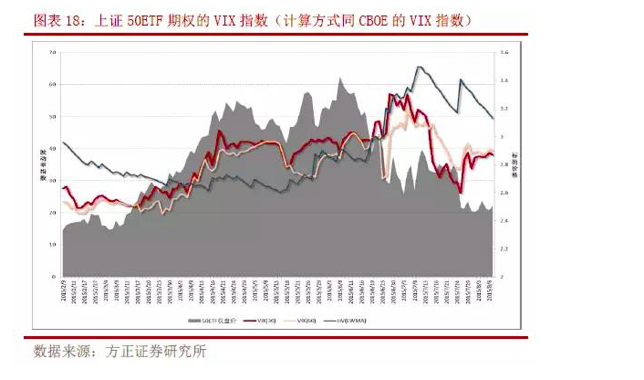 3.2 情绪指标:VIX指数本周VIX指数表现的非常平稳,30日的VIX指数基本在38-39之间窄幅震荡。同时现货价格也在低位窄幅震荡,显示出当前市场情绪较为谨慎。此前与标的价格走势同步的VIX指数在近期表现出了其“恐慌指数”应有的特征,即VIX指数与标的价格走势负相关。经历了这次股灾的风险教育,投资者或意识到标的价格在下跌时的速度更快,从而使得VIX作为“恐慌指数”的特征将愈来愈明显。