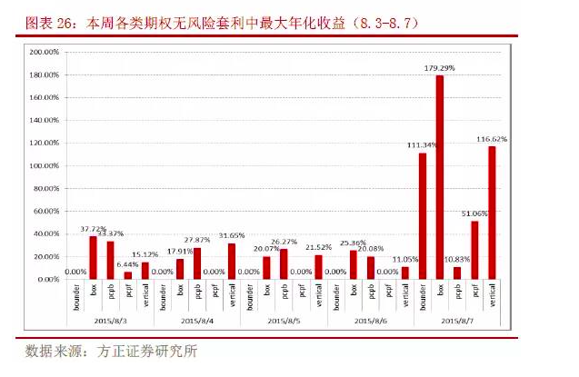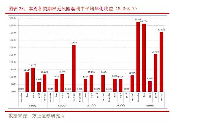 5. 本周期权市场各类无风险套利机会监控情况本周期权市场中依然存在着较多的套利机会,且各类型的套利机会均较为普遍,套利监控系统方面的问题可参见方正金工的专题研究报告《富贵何须险中求-期权无风险套利研究》。随着市场情绪趋于平静,期权无风险套利收益也较前期有所收窄。从监控的结果来看,周五套利收益出现暴涨,这是由于当天交易所的结算价出错,导致期权涨跌停价格有误从而影响了正常的交易,上交所于9:56暂时停止了上证50ETF期权合约的交易,随后在14:00恢复交易,之后上证50ETF期权交易正常。因此周五当天监控到了大量的套利机会。与上周一样,认沽期权相对认购期权的价格高估使得反向套利的收益颇丰,然而融券难的问题使得这一套利收益“可望而不可求”。不过同时用另一组期权合成现货空头来组成盒式套利的收益则是可获得并且同样表现颇佳。本周垂直价差套利收益也一样值得关注。