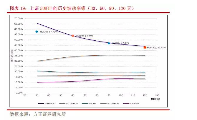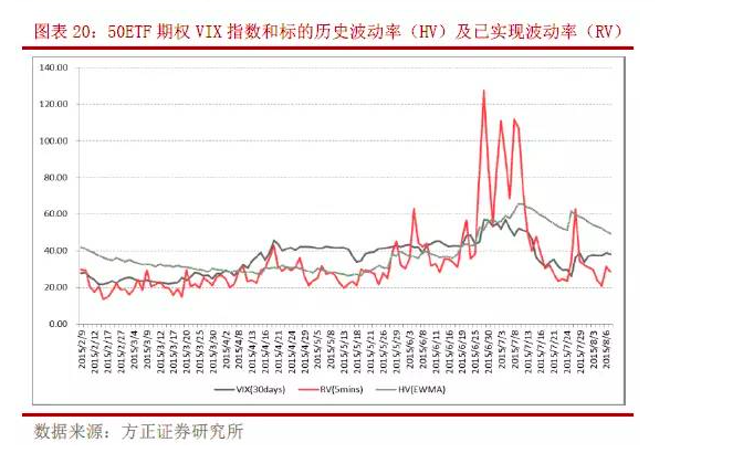 4. 波动率分析从上证50ETF价格的历史波动率锥来看(见图表19),随着本周历史波动率的回落,短期限的历史波动率已经从历史极值位置向下回落。与此同时,图表20显示已实现波动率(RV)也在本周冲高回落。HV和RV的同步下行有望限制IV继续攀升,但考虑到市场情绪依然较为脆弱,恐慌情绪呼之欲出,短线来看IV下行的空间也较为有限。
