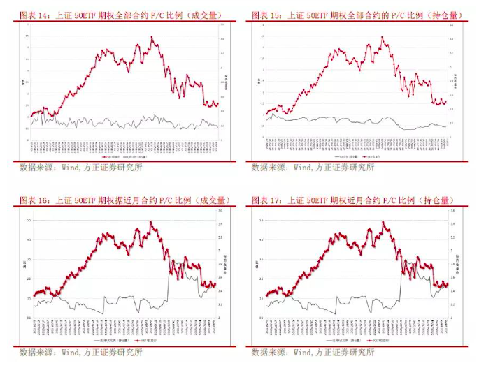 3. 期权市场中的情绪指标分析看跌/看涨(P/C)比例以及波动率指数(VIX)这两个期权市场的指标普遍被用于判断当前市场的多空情绪,从而可以对标的价格的走势给出一定的指引。3.1 情绪指标:P/C 比例图表14、图表15、图表16、图表17分别给出了50ETF期权近月合约、所有月份合约的成交量及持仓量的P/C比例,这里的P/C比例=认沽期权合约的成交量(持仓量)/认购期权合约的成交量(持仓量)。方正金工在2015-6-26《P/C比例,市场情绪及投资者结构的风向标》的报告中我们详细描述了P/C比例作为情绪指标的运用,不过由于目前50ETF期权市场的数据量有限,其统计意义并不明显。图表16、图表17中近月成交量、持仓量的P/C比例相对所有月份计算出来的指标更有指示意义。其中近月P/C(成交量)比例与标的价格走势呈现一定的同步性,而近月P/C(持仓量)比例与标的价格走势的负相关性较强,近月P/C(持仓量)比例从高位回落后又有再度上升的趋势,这对现货价格走势而言是一个不利信号。上证50ETF期权的P/C(成交额)比例顶部往往是行情阶段性见底的指标(参考方正金工2015-6-26的报告《P/C比例,市场情绪及投资者结构的风向标》)。我们注意到,P/C(成交额)比例在一段时间的高位钝化之后在上周创出历史新高。本周该比值有迅速向下回归的趋势,这对现货走势来说也是一个有利信号。若P/C(成交额)比例从高处回落至0.3左右的水平,市场或将真正见底。