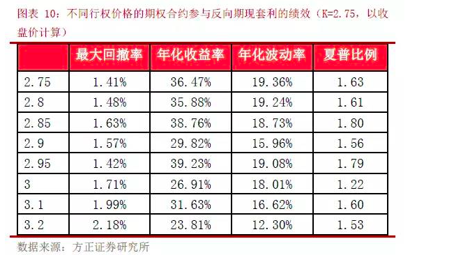 图表9展示的是策略回测的净值曲线图,利用期权合成现货空头来参与期指的反向期现套利可以获得非常不错的绩效。当然我们也可以用其他行权价格的期权合约了合成现货空头从而实现期指的反向期现套利(详情参见图表10)。