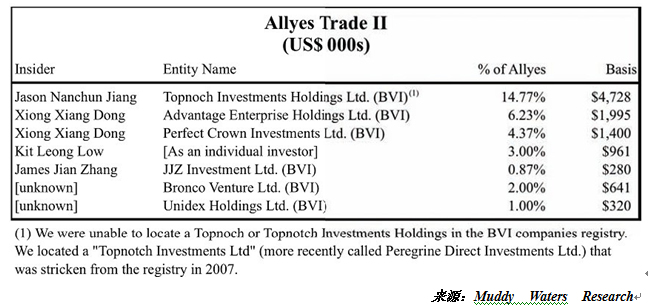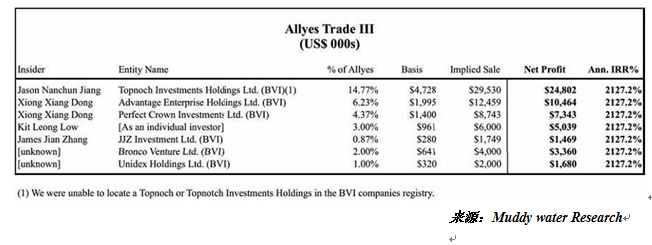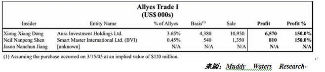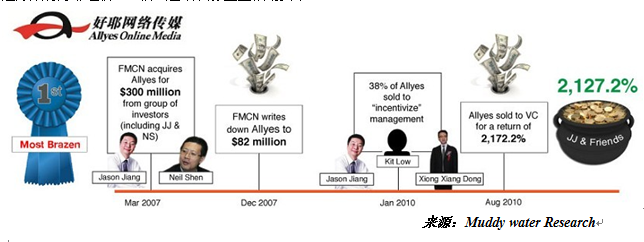 在好耶MBO完成7个月后,2010年8月2日,分众传媒宣布将好耶网络62%的股权以1.24亿美元卖给私募基金银湖资本,按照这一价格,分众传媒对好耶的总估值达到2亿美元,相比于MBO时对好耶的估值溢价4.7倍。分众传媒MBO好耶网络的38%股权价值7600万美元,“江南春和他的朋友们”在短短7个月内获利6270万美元,盈利幅度高达4.7倍。按照Muddy Waters的描述,这一交易使得江南春和他的朋友们的内部年化收益率超过21倍,而同时导致股东损失高达1.596亿美元。在本次交易中,内部人获利的分配如下表所示。1、 江南春:持有14.77%股权,获利2480.2万美元。2、 熊向东:通过两家离岸公司合计持有10.6%股权,获利1780万美元。3、 Kit Leong Low,即分众传媒CFO刘杰良,持股3%,获利503.9万美元。4、James Jian Zhang,好耶网络CFO张检,持有分众传媒0.87%股权,获利146.9万美元。张检此前曾担任过被分众收购的玺诚传媒的CFO。2009年9月到2010年9月,张检曾担任上市公司多元印刷的审计委员会主席及独立董事。2011年3月19日,多元印刷收到SEC传票,原因是SEC质疑多元印刷递交虚假财报、财报披露不充分及异常解聘德勤,多元印刷后被摘牌。2011年4月,纽约南区法庭审理认为多元印刷涉嫌提交虚假信息误导投资者,张检作为曾经的审计委员会主席也遭遇质疑。5、 Bronco Venture:注册于海外的离岸公司,持股2%,获利336万美元。6、 Unidex Holdings:注册于海外的离岸公司,持股1%,获利168万美元。