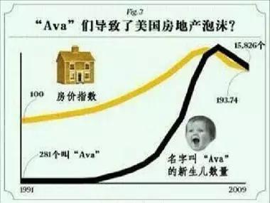 这个红线(图5)是希腊10年期国债的收益率,这个黄线就是Focebook的用户数量,这两个数据是没有任何关系的,对不对?但是它呈现了高相关性,如果按照技术分析,想知道希腊国债的收益率吗?关注Focebook,我如果不跟你说这个是Focebook,我就跟你说是某个神奇的跟八卦有关的一个东西,我随便编,你会觉得神指标、神指标。这是美国房地产的指数,这个(图6)是在AVA儿童出生的数量,也是没有关系的,对不对?