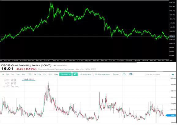 国内大家比较关心的是黄金,我知道黄金做的人多,特别是江浙一带,这个合约叫黄金波动率交易。什么意思呢?黄金大涨的时候这玩意(图4)就大涨,黄金大跌的时候这玩意还是大涨,黄金横盘不动的时候这个东西跌了,事实上就是做多波动率交易的意思。黄金趋势突破类的策略大家知道,就是赌它往一个地方动,你可以通过做空黄金波动和期货来进行对冲,如果你是做逢低做多、逢高做空那种区间振荡类策略的话,你可以配合做多黄金波动率期货来进行对冲。
