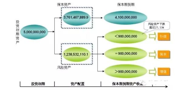 假定在该基金成立后的第t日,基金净资产变为6,000,000,000元,这时该基金对组合进行调整,第t日保本底线将变为5,500,000,000元,风险乘数为3,则第t日基金将以3×(6,000,000,000-5,500,000,000)=1,500,000,000元投资于风险资产,投资于保本资产的基金资产等于6,000,000,000-1,500,000,000=4,500,000,000元。