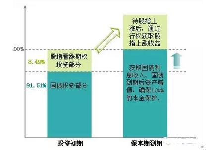 则保本型基金在投资初期大致只需要将91.51%的资金投资于3年期国债,并将剩余8.49%的资金购买盯住某一股票指数的看涨期权,从而即可做到保本,又可以享受未来股票指数上涨所带来的收益。