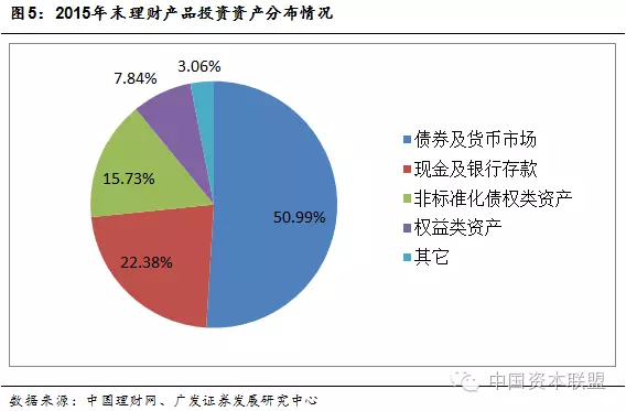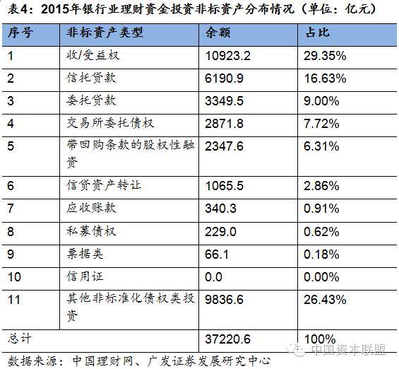 《中国银行业理财产品市场年度报告》显示,截至2015年底,全部理财产品投资各类资产余额23.67万亿元,涉及11大类72小类资产。从资产配置情况来看,债券及货币市场工具、银行存款、非标准化债权类资产是理财产品主要配置的前三大类资产,共占理财产品投资余额89.10%。理财产品投资于非标准化债权类资产的资金占投资总额的15.73%,规模约为3.72万亿,其中收/受益权占比重最大,占全部非标资产29.35%。