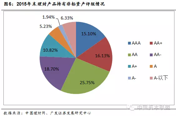 从理财产品所投资的非标资产的风险来看,整体信用风险相对较低。截至2015年底,理财资金投资的非标债权资产中,15.10%的资产评级为AAA,16.13%的资产为AA+,25.75%的资产为AA,A-级以下的资产仅占6.33%。