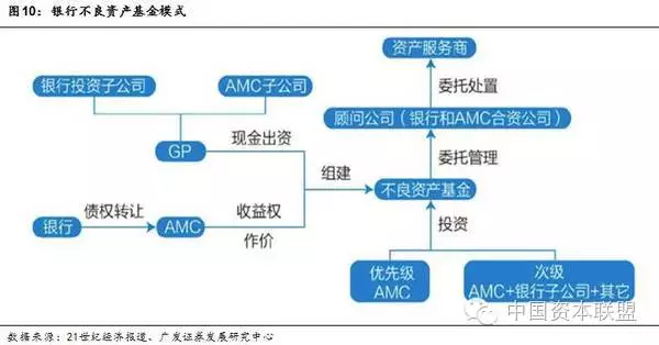 在中国银行不良资产基金模式中,不良资产处置基金由银行投资子公司和AMC子公司合资成立GP,以及AMC共同组建而成。其中,不良资产处置基金委托银行和AMC子公司的合资顾问公司进行管理,再由其委托资产服务商进行处置。对比不同的不良处置模式,该模式的特点,在于认购基金的资金中,没有直接来自银行的资金。优先级由AMC认购,次级投资人包括AMC,银行子公司和其他投资机构。