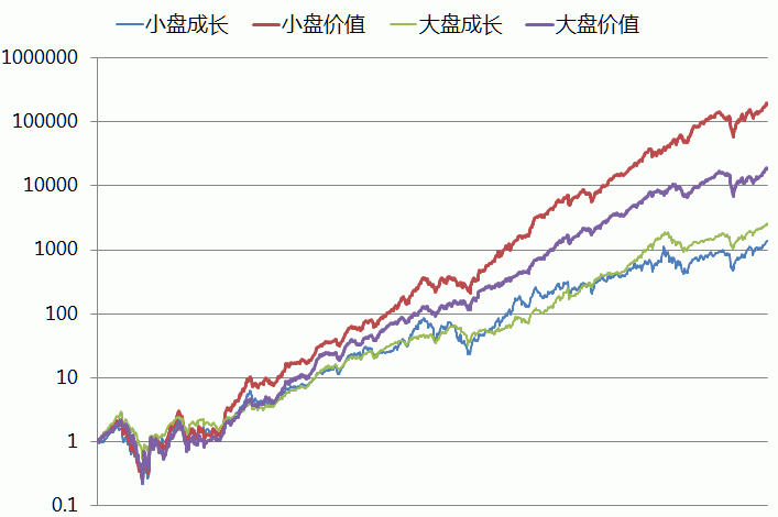 用上述数据库的数据计算可以发现,从1926年7月到2013年8月,小盘价值股是美股中回报最高的板块,年回报14.98%,与之对比小盘成长股年回报仅8.65%。至于大盘价值股,同样以11.93%的年回报跑赢大盘成长股9.4%的回报。可别小看这似乎只是几个百分点的差异,日积月累下,就变成天壤之别了。1926年的1元投入小盘成长股,到2013年8月将变成1383元,看起来增值显著,但与此同时若你改投小盘价值股,那就可以变成192154元,是前者的138.9倍!