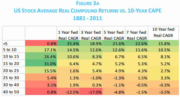 而研究者Mebane T. Faber利用罗伯特·希勒1881年到2011的CAPE数据做了回测,发现在CAPE小于10倍的时候买入美股,未来10年的年化收益率有望超过10%,但是若在超过20倍买入,则未来10年年化收益将低于3%,尤其是高于30倍,则将变成负回报。