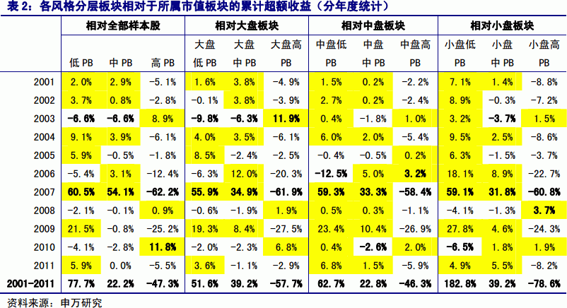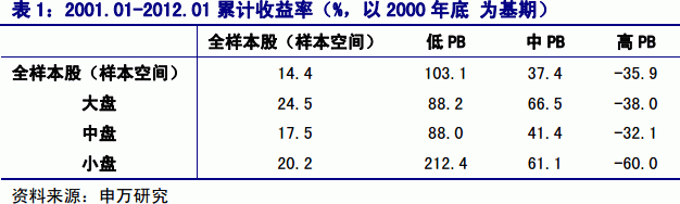 而2012年1月申银万国的一篇题为《从分层风格特征中寻找投资机会》的研究报告,则利用更长期的数据进行了确认。这份报告研究2001年1月到2012年1月的数据发现,小盘价值(低PB)股的累计回报是212.4%,而同期小盘成长股确为-60.0%;同时大盘价值股累计回报88.2%,同样也跑赢大盘成长股-38.0%。