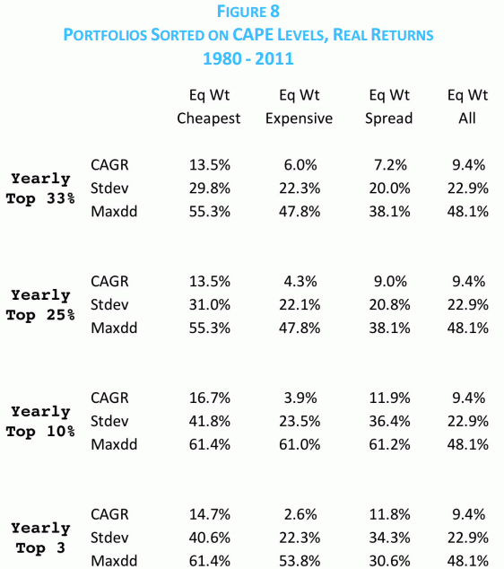 Faber进一步发现,如果不局限于美股,而是在全球主要股市中选出CAPE最低的三分之一持有,那么1980年到2011年之间的年化收益将可以达到13.5%,若仅持有最低的10%,则进一步提高到16.7%。