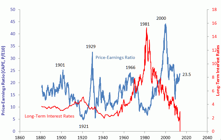 罗伯特·希勒的数据显示,美股的CAPE在5到6倍左右就是大底部了,而超过25倍就进入“非理性繁荣”的疯狂期了——2000年科网泡沫破裂前夕,这一数值一度高达44.2倍。目前,美股在经历了连续四年上涨之后, CAPE再度回到了23.5倍的高位——就历史来看,这已经处于需要警觉的相对高估区域了,对于美股投资者,若从基本面出发,要留神了。