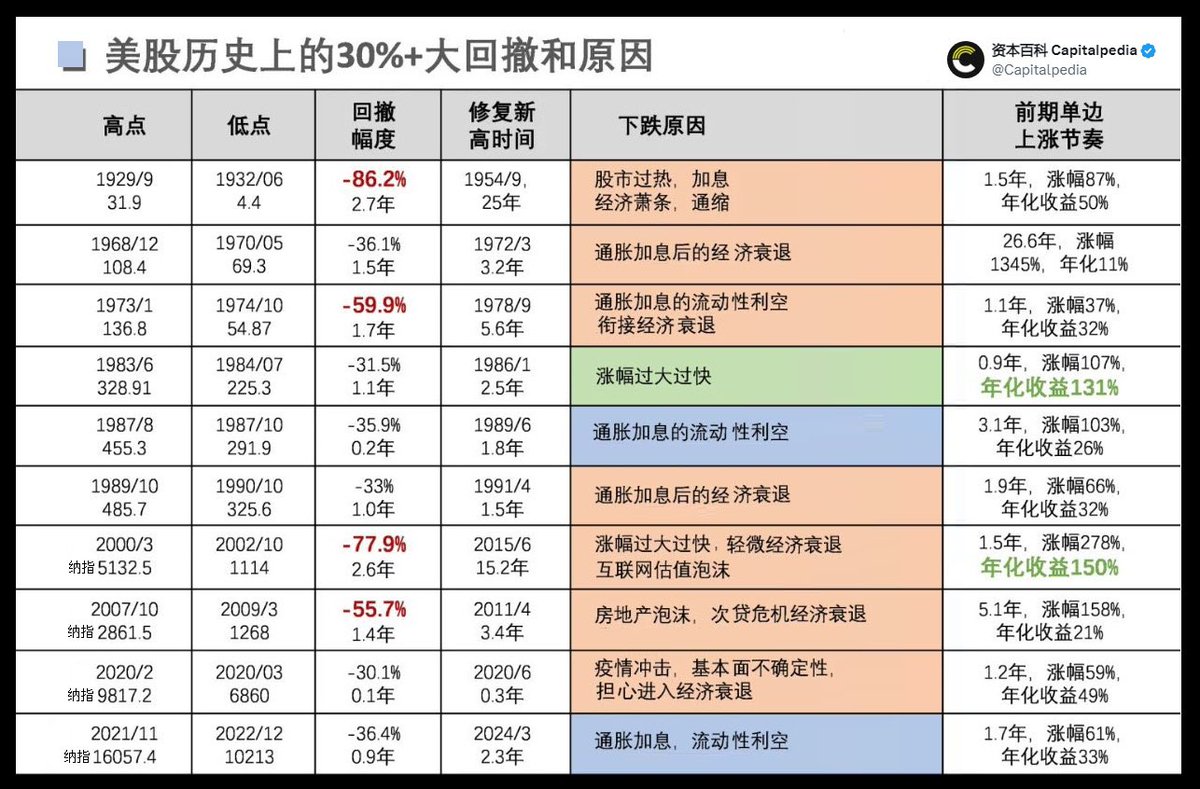 - 标普:跌了50%左右,跌了28%时开始回调。