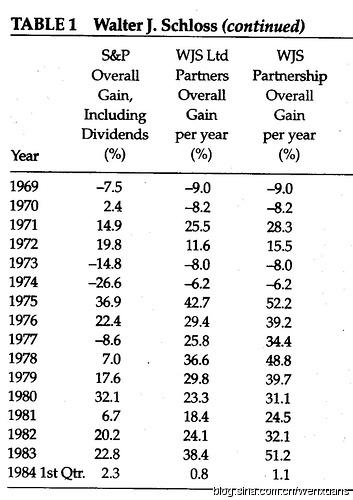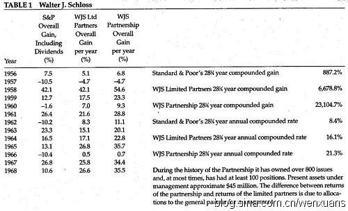 第一个案例(见表1)是沃特?斯科劳斯(Walter Schloss)的投资记录。沃特没有上过大学,但他在纽约金融学院(the New York Institute of Finance)选修了本.格雷厄姆教授的夜间课程。沃特1955年离开了格雷厄姆—纽曼公司,在其后28年中,他取得了以下投资业绩记录。亚当.史密斯(Adam Smith)经我介绍采访了沃特,他在他的著作《超级投资大师》(Supermoney,1972)中对沃特是这样描述的: