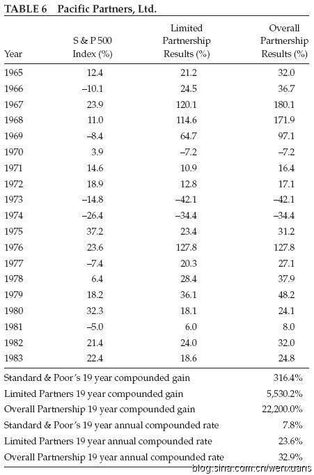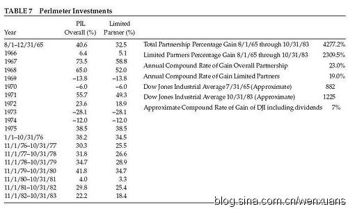 斯坦•波尔米塔(Stan Perlmeter)的投资业绩记录。他毕业于密西根大学艺术系,是波泽尔•雅各布斯(Bozell & Jacobs)广告公司的合伙人之一。我和他的办公室恰好位于奥马哈市的同一栋大楼。1965年,他发现我所从事的投资业比他从事的广告业前景更好,于是他离开了广告业。与李克•古瑞恩一样,斯坦•波尔米塔在五分钟之内就完全接受了价值投资理念。