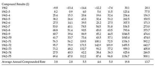 我认为,这群来自同一个智力家族的投资者们十分值得进一步的研究。顺便说一下,尽管所有的学术研究都关注类似于价格、数量、周期性、市值规模等因素对股价表现的影响,却从来没有证据表明学术界有兴趣研究这群非同寻常集中的价值导向的大赢家们所采用的投资策略。关于投资业绩记录的研究,我首先要从1954年到1956年间我们在格雷厄姆—纽曼公司(Graham-Newman Corporation)工作的四位同伴开始。我们总共只有四个人,我并不是从数以千计的投资人中挑选出这四个人的。我选修格雷厄姆的投资课程之后,要求进入这家公司无偿工作,但格雷厄姆却以我要价太高为由拒绝了我的要求,他对价值因素考虑得非常严肃和认真。在我一再恳求之下,他最后终于答应雇用我。当时公司有三位合伙人,还有我们四位当时对投资还不太在行的“小学徒”(the“peasant”level)。从1955年到1957年公司结束,我们四个人先后离开公司。目前我们能够追踪到其中三个人的投资记录。