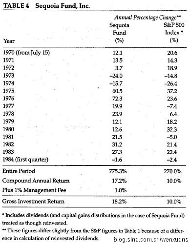 红杉基金(the Sequoia Fund)的投资业绩记录,该基金经理是比尔鲁安(Bill Ruane),1951年我们在格雷厄姆的课程中结识。他从哈佛商学院毕业后进入华尔街工作,他在工作中意识到自己需要接受一种真正的商业教育,于是报名参加了格雷厄姆在哥伦比亚大学的投资课程,1951年年初我们正是在那里相识。从1951年到1970年间,比尔所管理的资金规模相对于平均水平而言小得多,但投资业绩却远远超过平均水平。当我结束巴菲特合伙公司时,我问鲁安能否成立一家基金公司以吸收巴菲特合伙公司原来合伙人的资金,于是他就设立了红杉基金。他设立这只基金的时候恰恰在我结束合伙公司之时,这是一个非常糟糕的市场时机。他正好碰上了一个双重市场,并且遭遇了价值投资者相对业绩表现非常差劲的困难时期。我非常高兴地说,我原来的合伙人不但继续与他相守,而且追加了更多的资金,他取得如此优秀的投资业绩,当然让基金持有人非常满意。