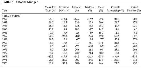 表5的投资业绩记录来自于我的一位朋友,他毕业于哈佛法学院,并且成立了一家律师事务所(又一个peasant level)。我在1960年前后认识他,当时我对他说,律师作为一种业余爱好相当不错,但是他完全可以在投资中做得更好。于是,他成立了一家投资合伙人公司。他的投资风格与沃特•斯科劳斯完全相反,他的投资组合集中于非常少数的证券,因此投资业绩的波动性很大,但他遵循的同样是寻找价值被低估股票的投资策略。他愿意接受投资业绩从高峰到低谷的大幅震荡,正如结果所表明的那样,他正好是那种心理能力完全适合集中投资的人。不用多说,这正是我在伯克夏公司的长期合作伙伴查理•芒格的投资业绩记录。不过,当他管理他自己的合伙公司时,他的投资组合与我以及前面提到的投资人完全不同。